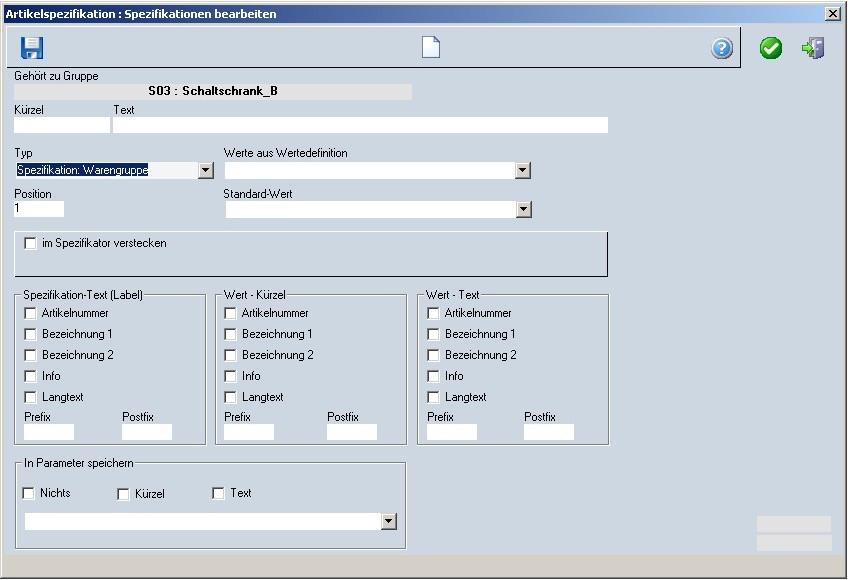 Über diesen Spezifikationstyp kann die Warengruppe manuell ausgewählt werden. Er sollte nur verwendet werden, wenn die Warengruppe nicht sinnvoll über die Spezifikationsgruppe festgelegt werden kann. Der Wertebereich kann auf eine Hauptwarengruppe eingeschränkt werden.