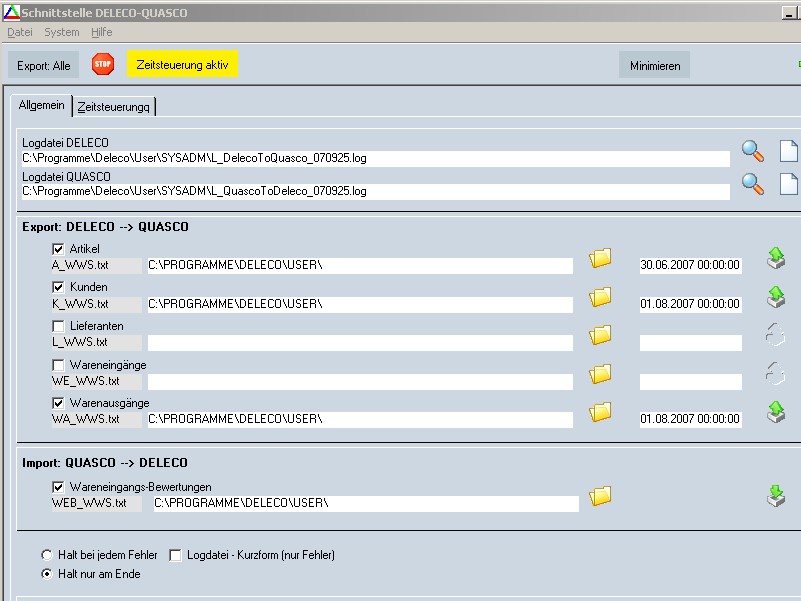 Beim Export existiert für jede Datenart ein Datenfeld, in welches das Exportdatum und die Exportzeit geschrieben wird. Beim erstmaligen Start der Schnittstelle ist es leer. In diesem Fall werden alle Daten der jeweiligen Datenart ausgegeben. Nach erfolgreichem Export wird immer der letzte Exportzeitpunkt hineingeschrieben. Beim nächsten Export werden alle Daten selektiert, welche sich seit diesem Zeitpunkt geändert haben. Das Feld kann manuell geändert werden.