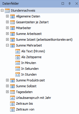 Dieses Objektfenster enthält die berichtsspezifischen Datenfelder. Es handelt sich hierbei um dynamische Daten, die sich pro Datensatz (z.B. pro Mitarbeiter) unterscheiden. Die Typen der Datenfelder sind anhand des Symbols zu erkennen.