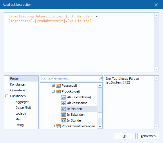 Abb.: Dialog "Ausdruck bearbeiten" zum Erstellen und Bearbeiten von Formelfeldern