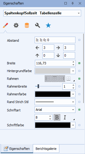 Das Objektfenster "Eigenschaften" gliedert sich in die Registerkarten "Aussehen", "Verhalten", "Daten", "Diverses" und "Favoriten". Diese beinhalten die Einstellungen eines jeden Steuerelements, Stils oder Bandes. Nachdem das gewünschte Element per Klick aktiv gesetzt wurde, werden seine spezifischen Eigenschaften geladen und können bearbeitet werden.