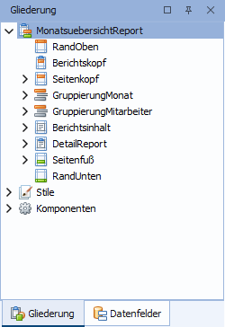 In der Registerkarte "Gliederung" ist der Aufbau der jeweils geöffneten Vorlage ersichtlich. Die einzelnen Bereiche, sogenannte Bänder, werden in einer Baumstruktur dargestellt. Per Klick wird der gewählte Bereich im Layoutfenster markiert. Eine neue Vorlage besteht aus einem oberen Rand, einem Seitenkopf, dem Berichtsinhalt, dem Seitenfuß und dem unteren Rand.