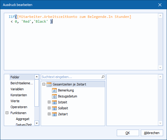 Beispiel: Wenn das Datenfeld "Arbeitszeitkonto zu Belegende" negativ ist, dann soll der Wert in roter Schriftfarbe angezeigt werden. Dafür wird an dem entsprechenden Datenfeld in der Eigenschaft "Schriftfarbe" der folgende Ausdruck hinterlegt: Iif([Monatsbezogene Kontodaten].[Arbeitszeitkonto].[In Stunden] < 0,'Red','Black')