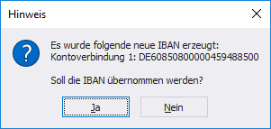 Anhand der in den Firmenparametern hinterlegten Bank und Kontonummer erfolgt eine Ermittlung der entsprechenden IBAN. Über eine Abfrage kann die ermittelte IBAN in den entsprechenden Firmenparameter übernommen werden.