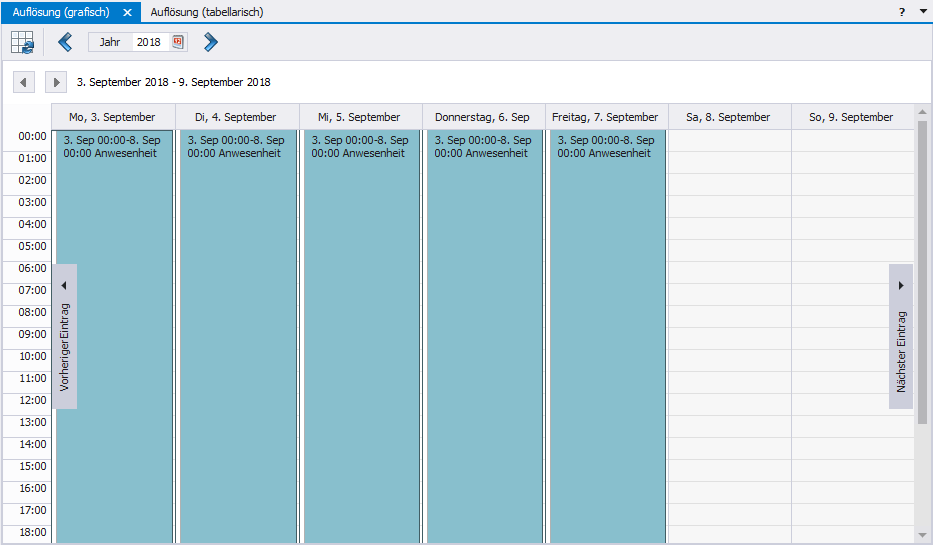 Auf der Registerkarte "Auflösung (grafisch)“ werden die verfügbaren Zeiträume des Kalenders grafisch dargestellt. Zur Darstellung werden die an der Zeitart hinterlegten Farben verwendet.