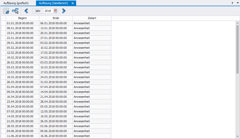 Auf der Registerkarte "Auflösung (tabellarisch)“ werden die verfügbaren Zeiträume des Kalenders als Tabelle dargestellt.