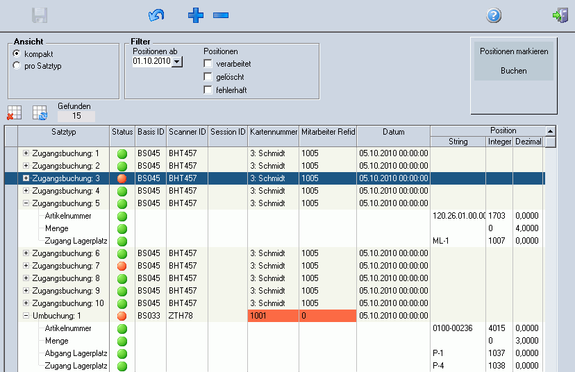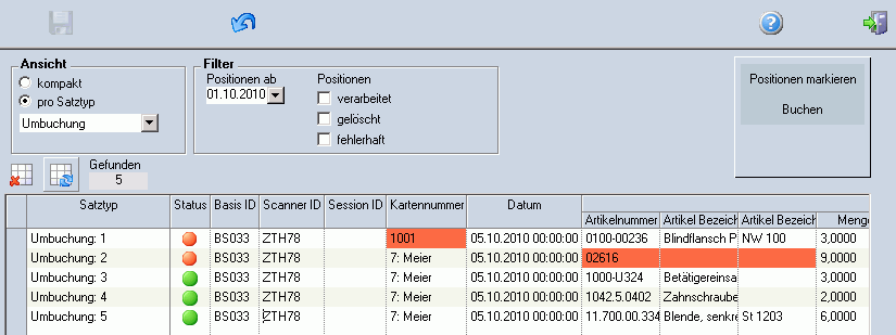 Eine farbliche Kennzeichnung an jeder Zeile zeigt, ob die Daten fehlerfrei sind oder nicht: