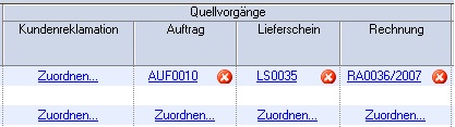 Über die folgenden Spalten können Quellvorgangsdokumente manuell zugeordnet werden, sofern dies nicht über das Anlegen aus einer Kundenreklamation oder eines Lieferscheins bereits erfolgte: