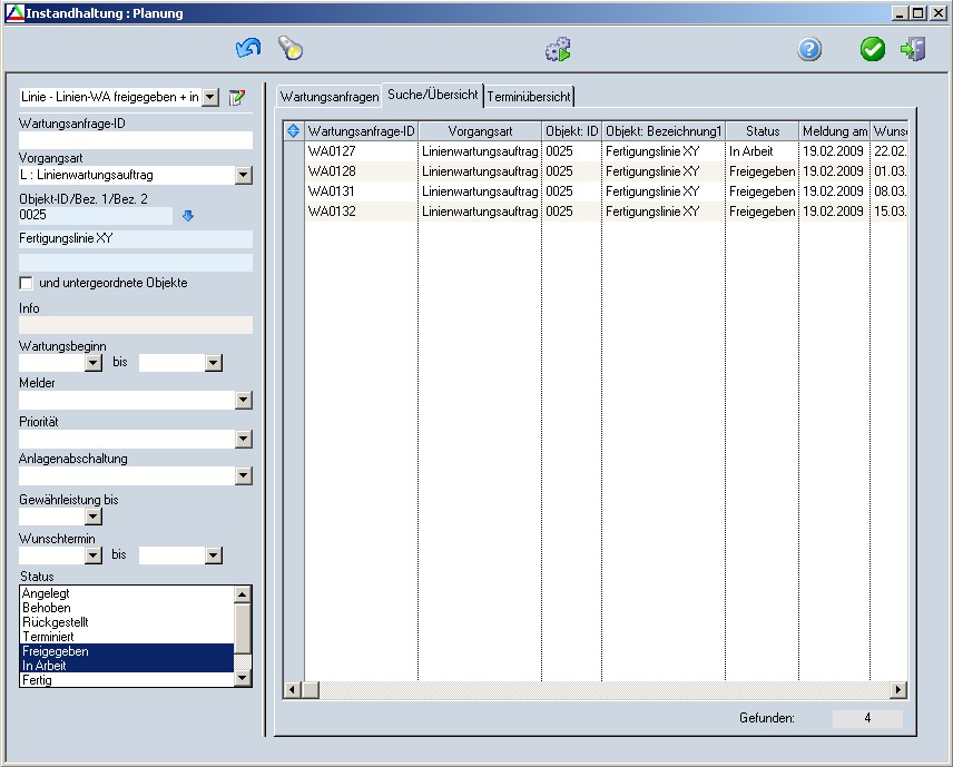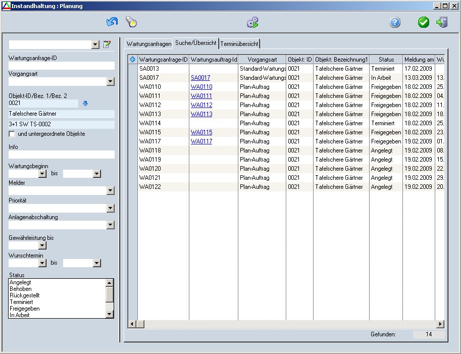 Nach dem Betätigen der Schaltfläche "Suchen" werden alle den ausgewählten Kriterien entsprechenden Wartungsanfragen aufgelistet.