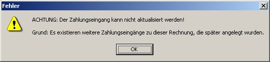 Der Zahlungseingang kann nur in der Währung, in welcher er angelegt wurde, bearbeitet werden. Es kann immer nur der letzte angelegte Zahlungseingang zu einer Rechnung/Gutschrift bearbeitet werden. Beim Speichern erfolgt ein Hinweis.
