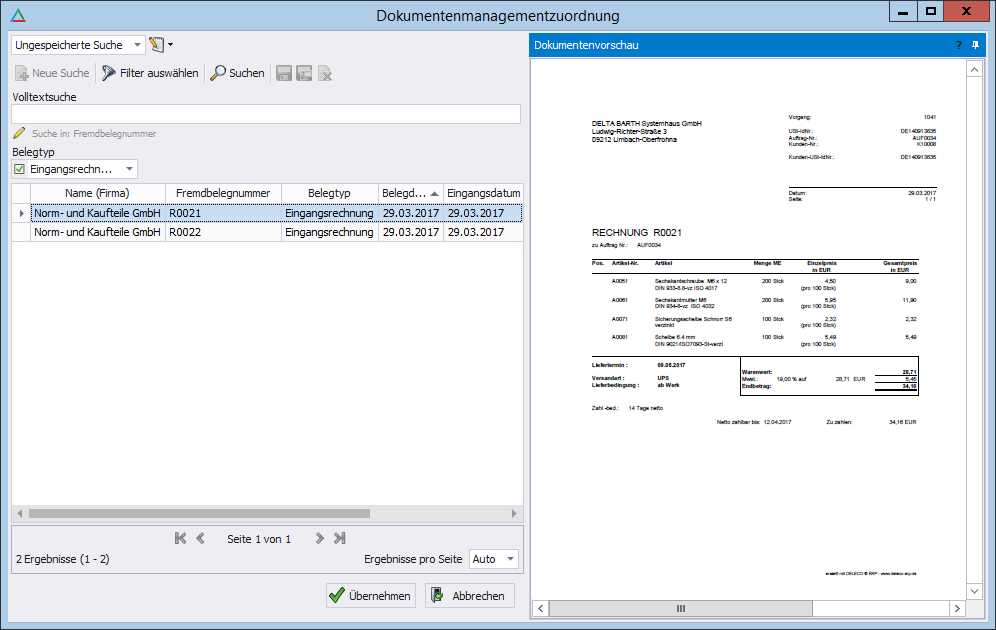 Wurde ein Rechnungsbeleg ausgewählt, wird die Rechnung in DELECO angelegt. Dabei erfolgt die Übernahme der zugeordneten Informationen wie Lieferant, Fremdbelegnummer, Beleg- oder Eingangsdatum. Im Modul wird zudem eine Dokumentenvorschau des Dokuments aus dem Dokumentenmanagementsystem angezeigt.