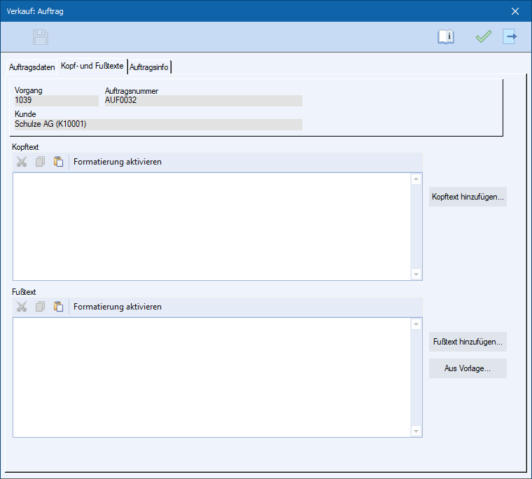 Der Inhalt der Felder Kopftext und Fußtext wird auf den Belegen im Bereich der Kopf- bzw. Fußzeile gedruckt. Sie können den Text im Feld erfassen oder einen Textbaustein über die Schaltflächen "Kopftext hinzufügen..." bzw. "Fußtext hinzufügen..." einfügen. Möchten Sie den Text formatieren, verwenden Sie die Schaltfläche "Formatierung aktivieren".