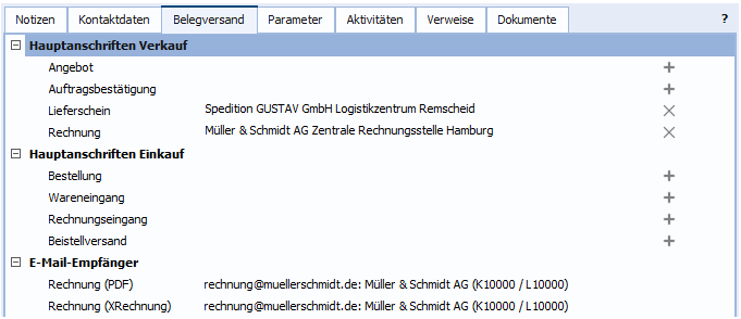 HauptanschriftenFür eine Firma können verschiedene abweichende Anschriften definiert werden. Diese werden beim Anlegen von Vorgängen und Dokumenten voreingestellt und können im jeweiligen Datendialog geändert werden.