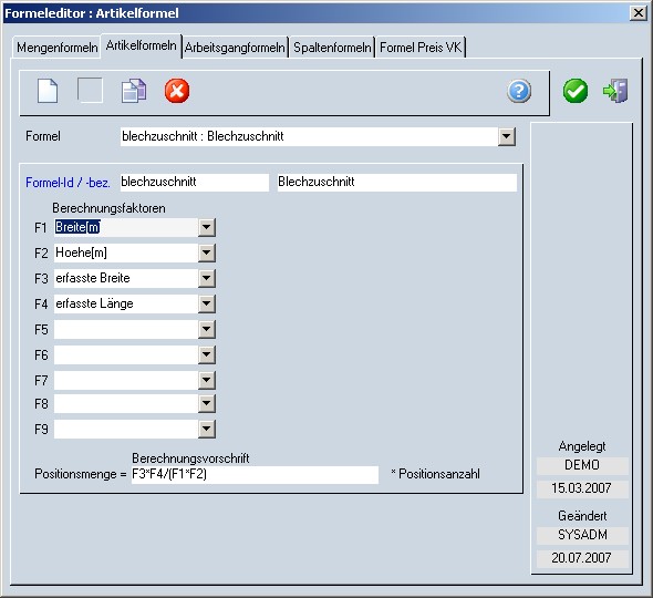 MengenformelnSie dienen zur Berechnung von Positionsmengen und erlauben die Berechnung der Positionsmenge durch Eingabe von Faktoren in den Modulen Kalkulation, Technologie und Fertigungsauftrag. Ihre Bearbeitung und Benutzung wird im Kapitel Kalkulation beschrieben.