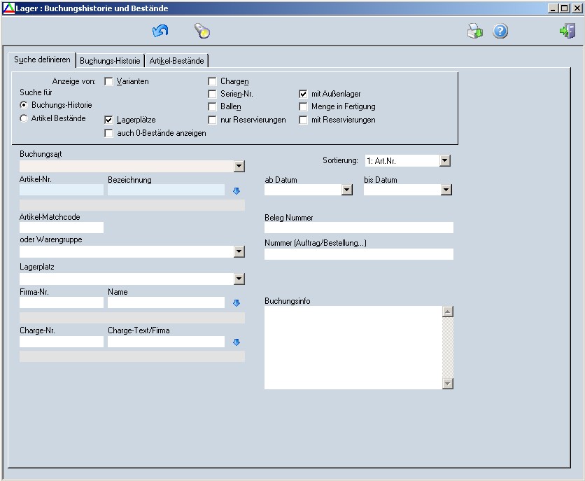 Sowohl die Anzeige von Beständen, als auch die der Buchungshistorie lassen sich über die Registerkarte "Suche definieren" nach verschiedenen Gesichtspunkten gestalten und auch einschränken, so z.B. nach Artikeln, nach Lagerplätzen oder nach bestimmten Firmen.