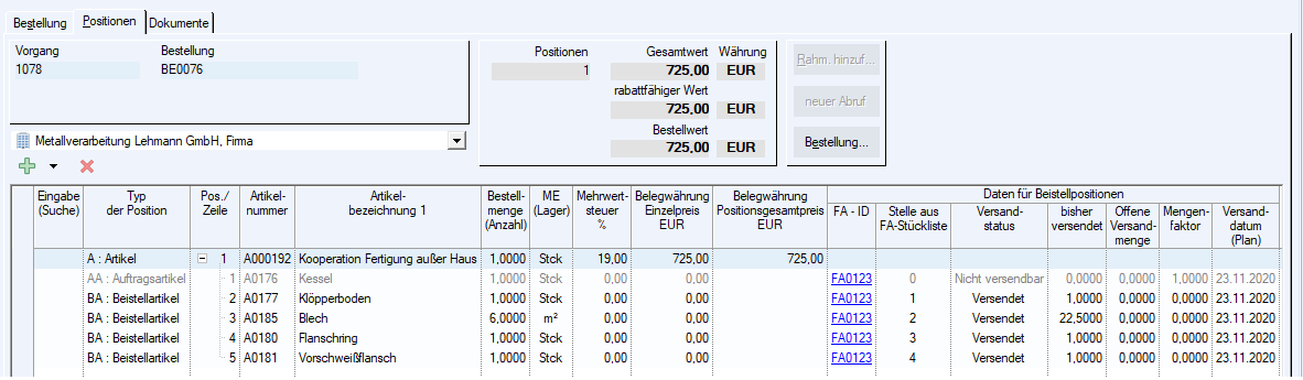 Modulnavigation: Bereich Module - Modulgruppe Einkauf - Modul Bestellung - Registerkarte Positionen