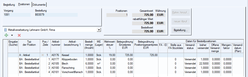 Modulnavigation: Bereich Module - Modulgruppe Einkauf - Modul Bestellung - Registerkarte Positionen