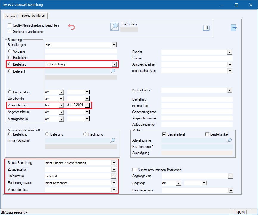 Achtung: Diese Funktion gilt nur für Standard-Bestellungen. Es wird empfohlen für das Filtern der Bestellungen die Filter "Bestellart", "Liefer- oder Zusagetermin" sowie die Statusfilter "Status Bestellung", "Lieferstatus" und "Rechnungsstatus" zu nutzen.