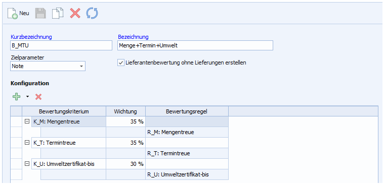 Durch die individuelle Zusammenstellung von Kriterien und die Aktivierung der zugehörigen Regeln kann ein Lieferant den jeweiligen Anforderungen entsprechend bewertet werden.