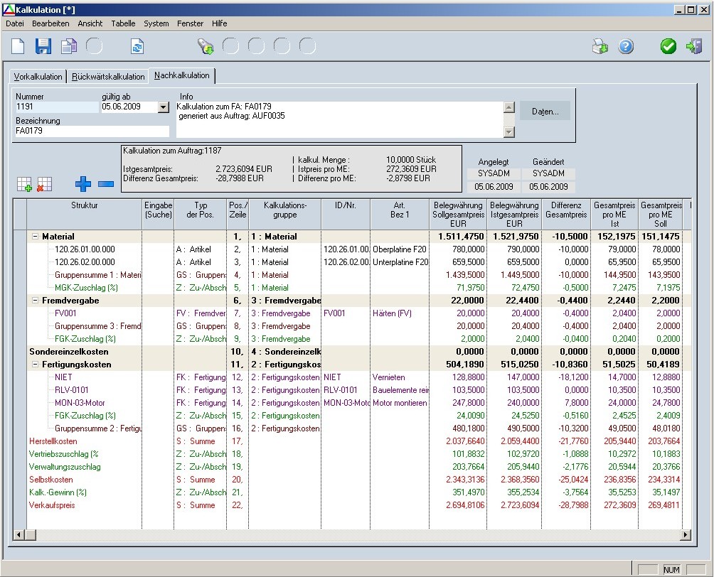 Die Eingabefelder entsprechen in Inhalt und Anordnung den Eingabefeldern der Vorkalkulation.