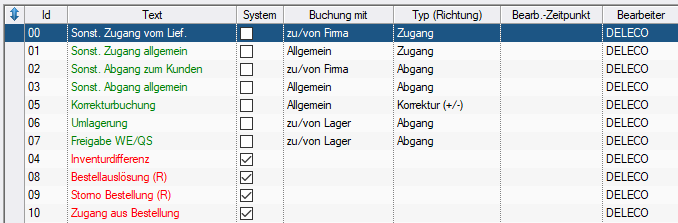 Die aktivierten Buchungsarten werden vom System genutzt und können nicht beeinflusst werden. Alle anderen werden individuell vergeben, können geändert oder gelöscht werden. Mit diesen Buchungsarten können manuell Lagerbewegungen verbucht werden.