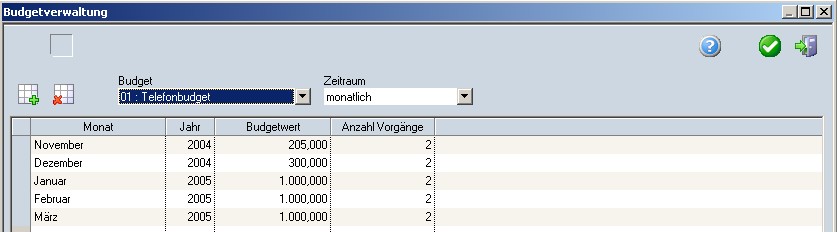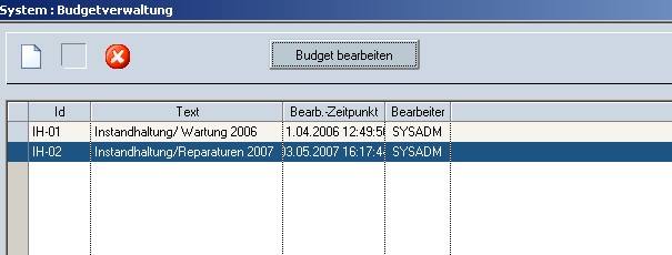 Die Programmfunktionalität bietet die Möglichkeit, Budgets anzulegen und zu verwalten. Zu jedem Budget muss es mindestens einen Artikel geben, welchem unter Parameter das entsprechende Budget zugewiesen wird. Beim Rechnungsabgrenzungslauf (siehe Rechnungseingangsprüfung) werden die entsprechenden Istwerte aus der Rechnungseingangsprüfung ermittelt und offene Budgetwerte gebildet.