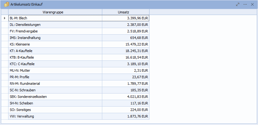 KompaktansichtDas Widget "Artikelumsatz Einkauf" zeigt in der Kompaktansicht standardmäßig den Umsatz der Artikel pro Warengruppe an. Der Artikelumsatz Einkauf ist dabei nach dem aktuellen Jahr gefiltert. Die Sortierung erfolgt aufsteigend nach der Warengruppe.