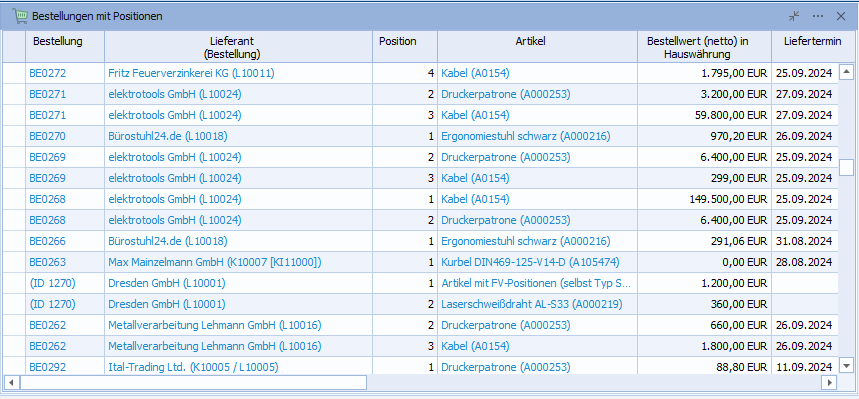 DetailansichtIn der Detailansicht entspricht das Widget "Bestellungen mit Positionen" standardmäßig der gleichnamigen Auswertung. Es stehen die gleichen Spalten wie in der Auswertung zur Verfügung, die Sie für eine individuelle Darstellung in der Detailansicht verwenden können. Es wird standardmäßig zuerst nach der Spalte "Angelegt am" und dann nach "Lieferant (Bestellung)" absteigend sortiert (aktuellste Werte stehen oben). Weitere/ andere Sortierungen sind individuell möglich.