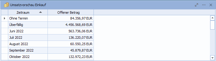 KompaktansichtDas Widget "Umsatzvorschau Einkauf" zeigt in der Kompaktansicht standardmäßig den zu erwartenden Umsatz noch nicht berechneter Bestellpositionen an. Die Umsatzvorschau ist nicht gefiltert. Die Sortierung erfolgt aufsteigend nach dem Zeitraum.