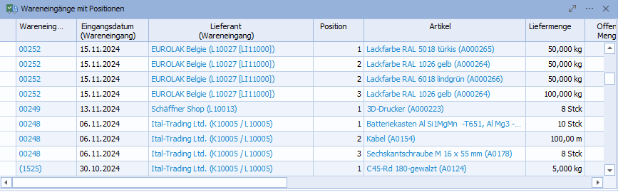 Zugehörige Auswertung:Auswertung Wareneingänge mit Positionen