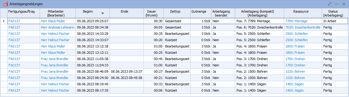 Zugehörige Auswertung: Arbeitsgangmeldungen