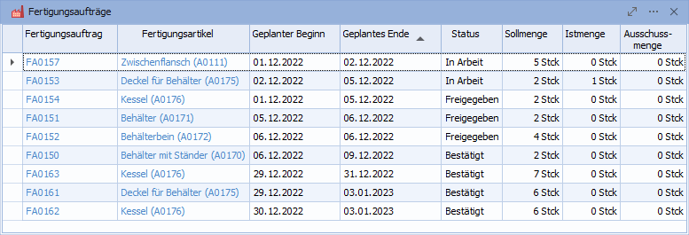 Zugehörige Auswertung: Fertigungsaufträge als Tabelle