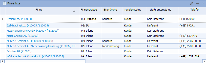 In der Detailansicht entspricht das Widget "Firmenliste" standardmäßig der gleichnamigen Auswertung. Es stehen die gleichen Spalten wie in der Auswertung zur Verfügung, die Sie für eine individuelle Darstellung in der Detailansicht verwenden können.