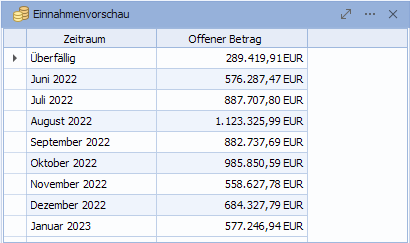 DetailansichtIn der Detailansicht entspricht das Widget "Einnahmenvorschau" standardmäßig der Auswertung "Einnahmenvorschau" im Ausgabeformat "Pivottabelle". Es stehen die gleichen Spalten wie in der Auswertung zur Verfügung, die Sie für eine individuelle Darstellung in der Detailansicht verwenden können.