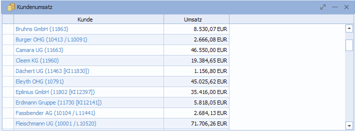DetailansichtIn der Detailansicht entspricht das Widget "Kundenumsatz" standardmäßig der Auswertung "Umsatz Kunden " im Ausgabeformat "Pivottabelle". Es stehen die gleichen Spalten wie in der Auswertung zur Verfügung, die Sie für eine individuelle Darstellung in der Detailansicht verwenden können.