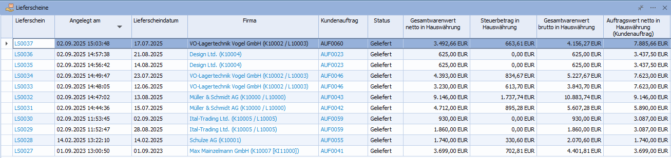 In der Detailansicht entspricht das Widget "Lieferscheine" standardmäßig der gleichnamigen Auswertung. Es stehen die gleichen Spalten wie in der Auswertung zur Verfügung, die Sie für eine individuelle Darstellung in der Detailansicht verwenden können.