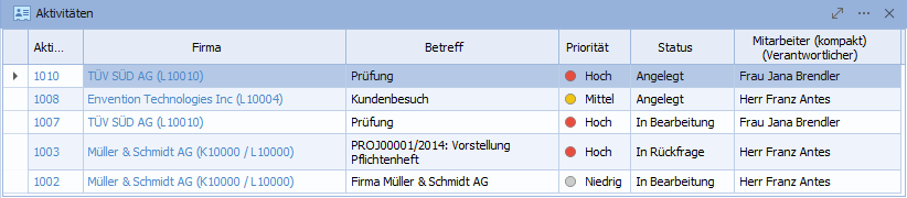 KompaktansichtDas Widget "Aktivitäten" zeigt in der Kompaktansicht standardmäßig alle fälligen Aktivitäten an. Die Sortierung erfolgt absteigend nach der Aktivitätsnummer. Über die vorhandenen Links kann per Mausklick zu der Aktivität oder der Firma navigiert werden. Wichtige Informationen können Sie über bedingte Formatierungen farblich hervorheben.