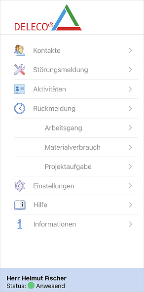 FunktionsumfangMit der DELECO App können Sie Funktionen aus folgenden Bereichen nutzen: •Kontakte: Suche nach Firmen, Ansprechpartnern und Anschriften sowie Kontaktaufnahme per Telefon oder E-Mail oder Öffnen der Webseite. •Störungsmeldung: Anlegen und Bearbeiten von Wartungsaufträgen der Auftragsart "Störungsauftrag". •Aktivitäten: Neben einer Übersicht über fällige oder kommende Aktivitäten, können Aktivitäten kontaktbezogen erfasst oder bearbeitet werden. •Rückmeldung: Erfassen von Anwesenheitszeiten, Produktivzeiten für Projektaufgaben und Arbeitsgänge sowie Materialmeldungen.