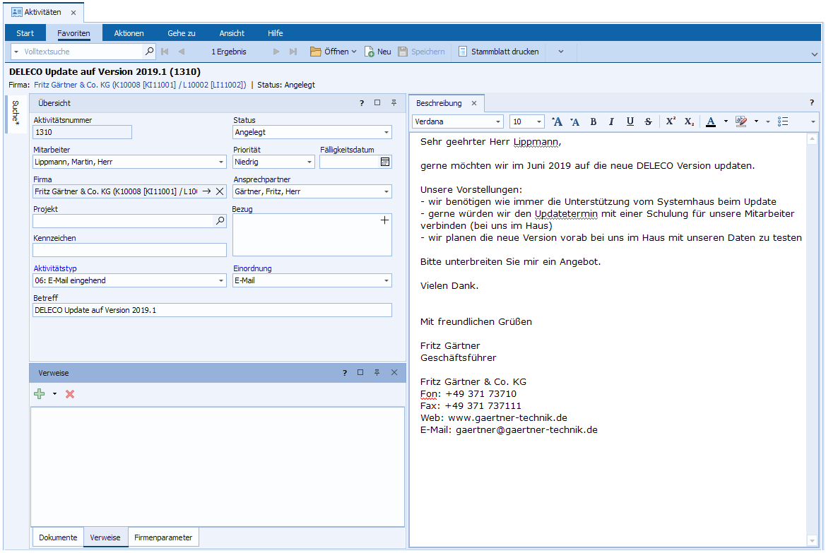 Firmen und Ansprechpartner werden mit Hilfe der im Modul "Firma" hinterlegten Stammdaten automatisiert erkannt.