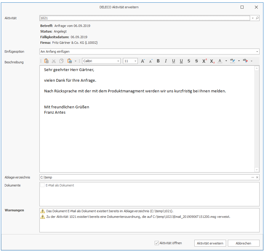 Anschließend kann ausgewählt werden, ob die erstellte Aktivität nach dem Anlegen in DELECO geöffnet werden soll. Dies kann in den Einstellungen des Add-ins voreingestellt werden.