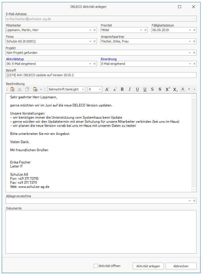 E-Mail-Anhänge können dabei im Dateisystem abgelegt und als Link in eine Aktivität übernommen werden.