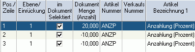 Als weitere Positionen werden alle bisherigen Anzahlungen mit negativem Vorzeichen als einzelne Positionen eingefügt. Diese Positionen dürfen nicht geändert werden.