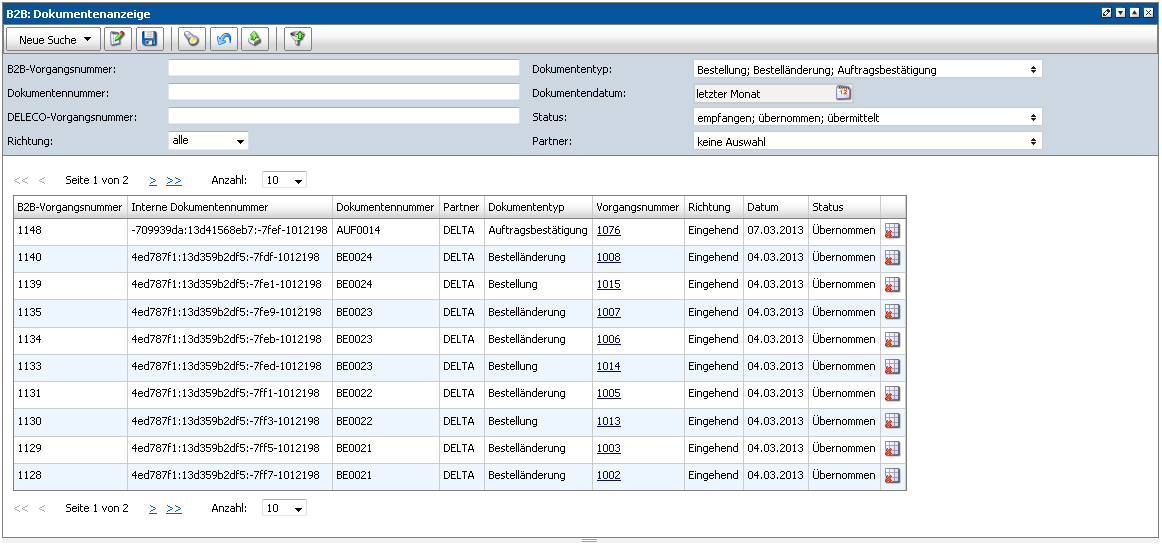 Das Portlet "B2B: Dokumentenanzeige" zeigt alle versendeten, empfangenen oder im Prozess befindlichen B2B-Dokumente an.