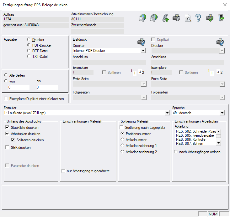 Über die Auswahlbox kann festgelegt werden, dass nur Arbeitsgänge gedruckt werden, deren Abteilung markiert ist. Ist keine Abteilung markiert, werden alle Arbeitsgänge gedruckt.
