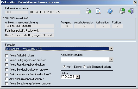 Beim Druck von Artikelkalkulationen zu den einzelnen Kalkulationspositionen wird jeweils die Artikelkalkulation gedruckt, die zum angegebenen Datum gültig war.