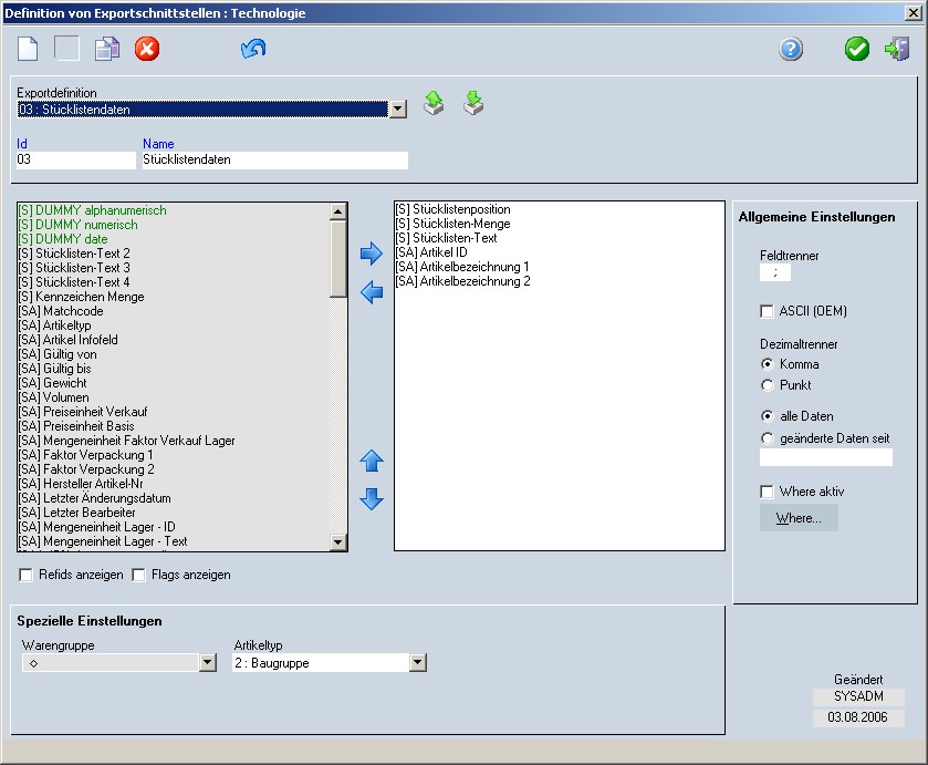 Folgende spezielle Einschränkungen können beim Stücklistenexport getroffen werden: