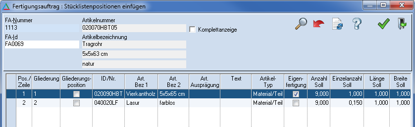 Zuerst ist der Fertigungsauftrag, welcher die einzufügenden Positionen enthält, einzugeben oder auszuwählen. Anschließend werden die Stücklistenpositionen des gewählten Fertigungsauftrags angezeigt. Die Auswahl "Komplettanzeige" steuert den Umfang der für jede Stücklistenposition angezeigten Daten. Ist das Auswahlfeld nicht aktiviert, wird die Tabelle wesentlich schneller gefüllt. Das ist besonders bei Fertigungsaufträgen mit vielen Materialpositionen empfehlenswert. Wird die Auswahl "Komplettanzeige" aktiviert, dann werden auch die Formeln, Mengeneinheiten und Artikelbeschreibung der Positionen mit angezeigt.