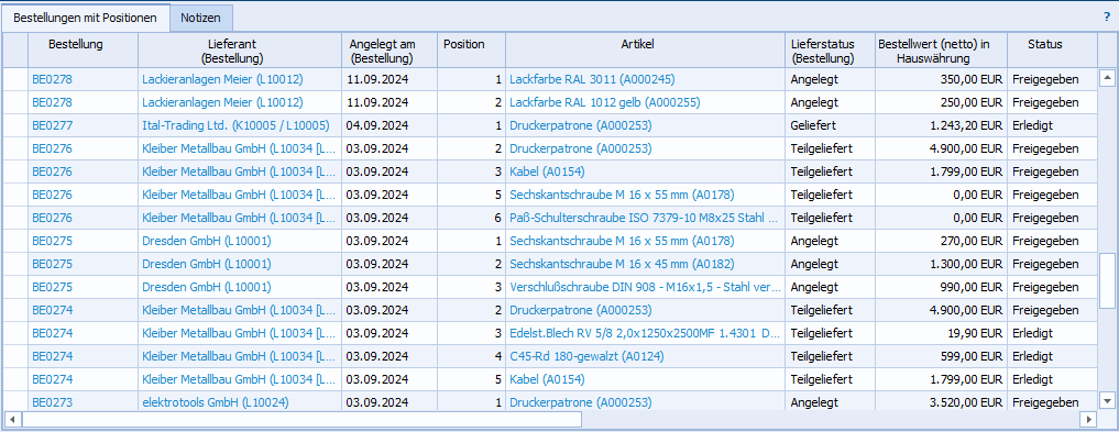 Sortierreihenfolge: Wenn Sie sich die Auswertung anzeigen lassen, wird das Suchergebnis standardmäßig zuerst nach der Spalte "Angelegt am (Bestellung)" und dann nach "Lieferant (Bestellung)" absteigend sortiert (aktuellste Werte stehen oben). Anschließend erfolgt die Sortierung nach den Spalten "ID (Bestellung)" absteigend und danach nach der Spalte "Position" aufsteigend.