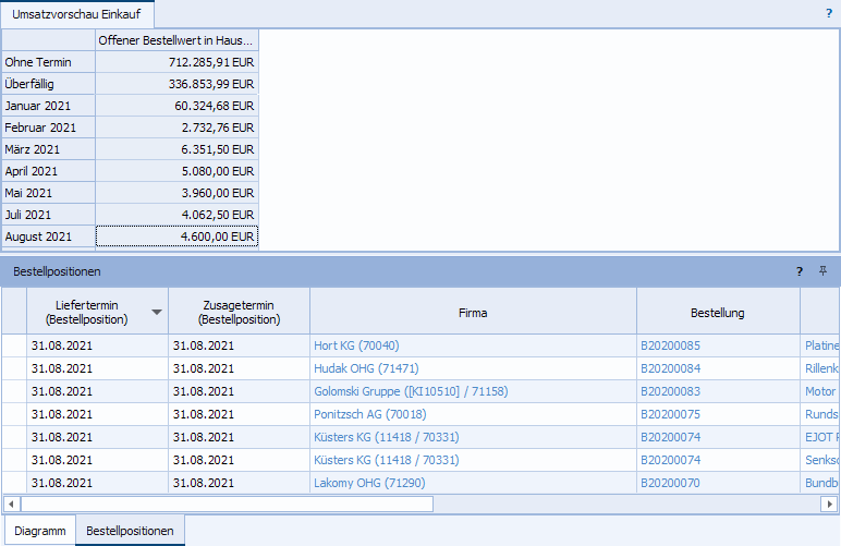 Im Bereich "Bestellpositionen" werden die zugehörigen Positionen angezeigt, je nach gewähltem Zeitraum in der Registerkarte "Umsatzvorschau Einkauf". Eine Auswahl des Zeitraumes für die Bestelldaten kann für eine oder mehrere Zellen erfolgen. Über die vorhandenen Links kann per Mausklick unter anderem zu den Daten der Bestellung, des Artikels oder des Projekts navigiert werden.
