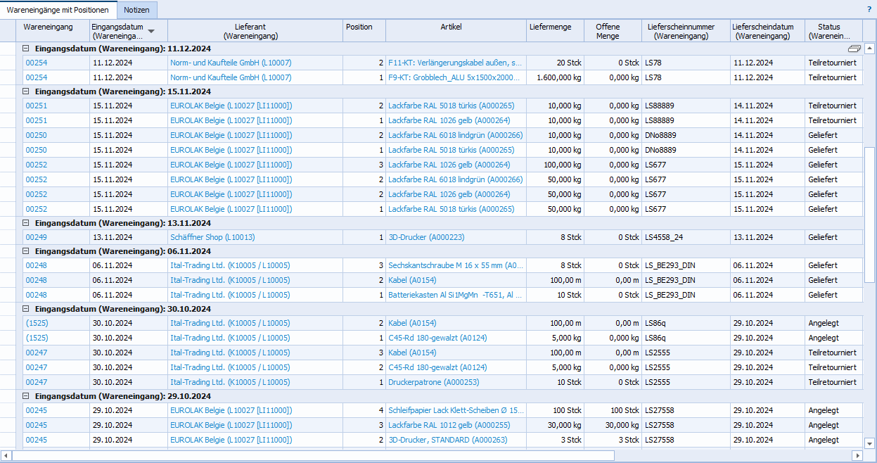 Auswertung Wareneingänge mit Positionen |